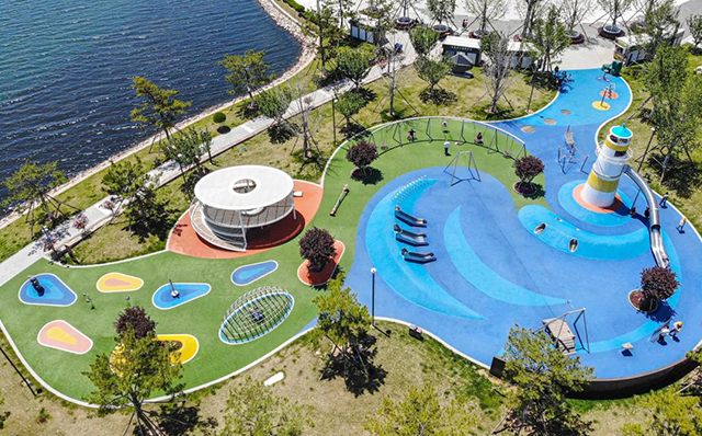 平靜的水面隨風蕩起波浪,一只斑斕的鳳凰騰起,翱翔于半空之中,掠過湖面卷起無數(shù)的水汽和水珠,泛起朵朵浪花,伴隨著升騰,水汽漸漸散去,露出了一個巨大的身影,巧妙地呈現(xiàn)出鳳凰形態(tài)。威海石島鳳凰湖公園兒童活動場地、健身運動場地面積共計2800㎡。設計師結合地形獨特性,將兩個場地一分為二,鳳身為兒童活動場地,鳳尾為健身運動場地。